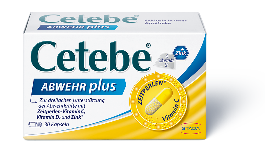 Es gibt Zeiten und Situationen, in denen das Immunsystem besonders gefordert ist. Dann kann Cetebe® ABWEHR plus die Abwehrkräfte sinnvoll unterstützen. Denn mit Vitamin D, Vitamin C und Zink liefert Cetebe® wichtige Vitalstoffe für unser Immunsystem: